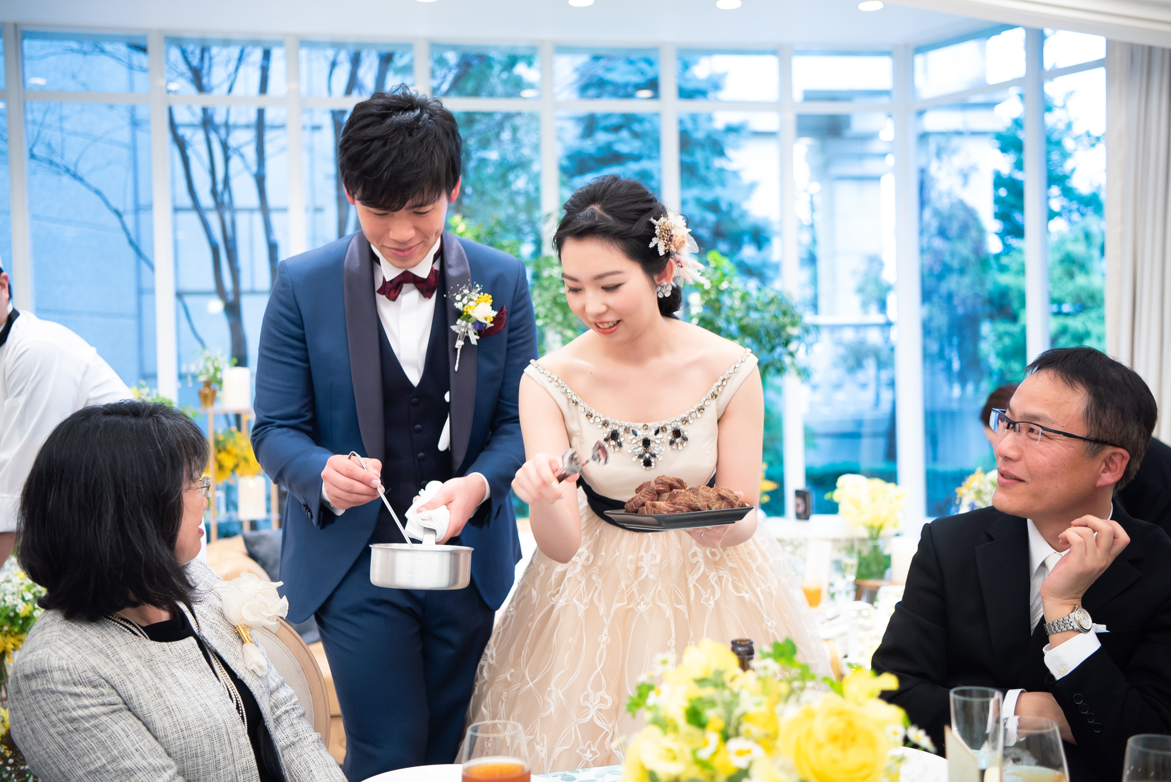 ゲストの皆様へのおもてなしをして自分達でお肉料理を完成!